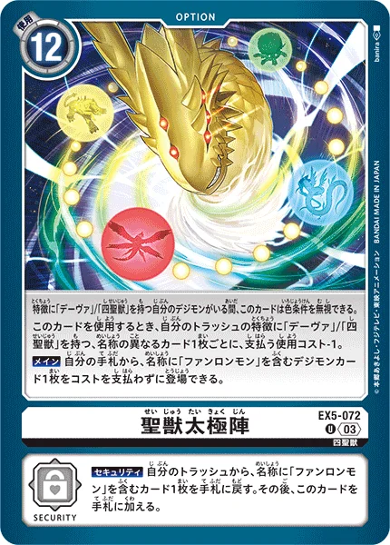 我方场上存在拥有“十二神将”/“四圣兽”特征的数码宝贝期间,此卡牌可以无视颜色条件。