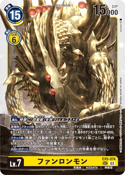 登场时攻击时可从我方的废弃区中,将最多4张拥有“十二神将”/“四圣兽”特征的卡牌放回到卡组最下方,每放回1张,直到回合结束为止,对方所有数码宝贝的DP-4000。