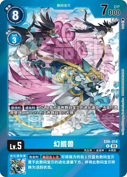 登场时进化时可以从我方蓝色数码宝贝的进化源中,不支付费用登场1张Lv.3的蓝色数码宝贝卡牌。