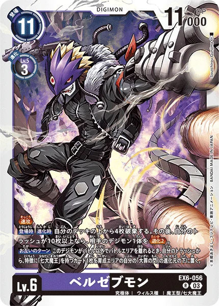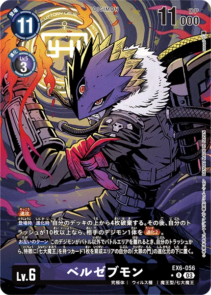 登场时进化时丢弃我方卡组最上方的4张卡牌。此后,若我方的废弃区中有10张或更多卡牌,则将对方的1只数码宝贝退化2。 双方的回合当此数码宝贝因战斗以外的方式将要离开战斗区时,从我方的废弃区中,将1张拥有“七大魔王”特征的卡牌置于我方养成区中“大罪之门”的进化源最下方。
