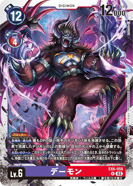 登场时进化时消灭对方1只DP最低的数码宝贝。丢弃我方卡组最上方张数为通过此效果消灭的数码宝贝Lv.数值的卡牌。