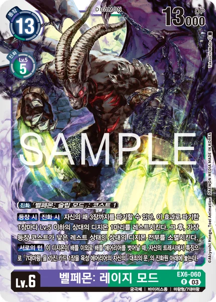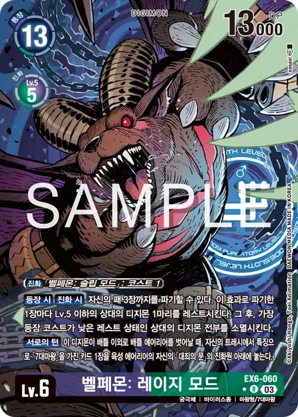 登场时进化时可以丢弃我方的最多3张手牌。通过此效果每丢弃1张卡牌,将对方1只等级不高于Lv.5的数码宝贝转换为休息状态。此后,消灭对方所有登场费用最低且处于休息状态的数码宝贝。