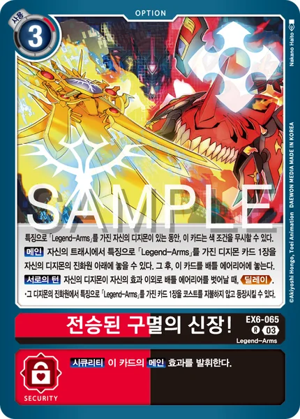 双方的回合当我方数码宝贝因我方效果以外的方式将要离开战斗区时,延迟。 ·可以从该数码宝贝的进化源中,不支付费用登场1张拥有“Legend-Arms”特征的卡牌。