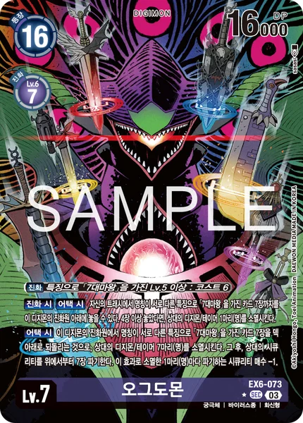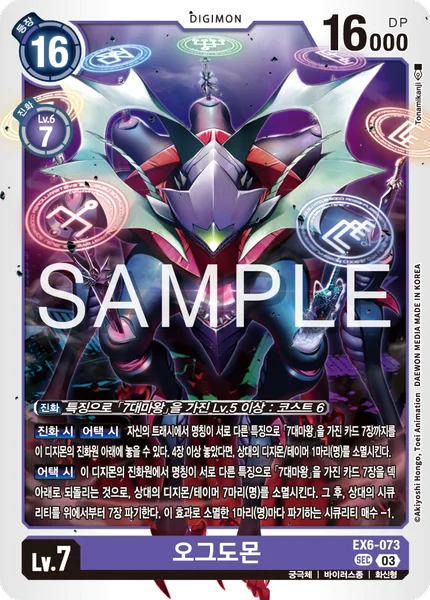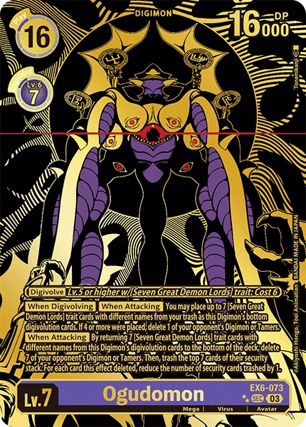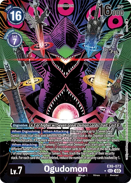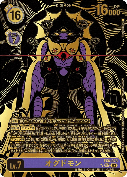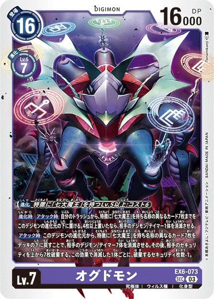 攻击时可从此数码宝贝的进化源中,将7张拥有“七大魔王”特征且名称不同的卡牌放回到卡组最下方,并消灭对方的7只数码宝贝/驯兽师。此后,丢弃对方安防区最上方的7张卡牌。通过此效果每消灭1只,丢弃的安防卡牌张数-1。